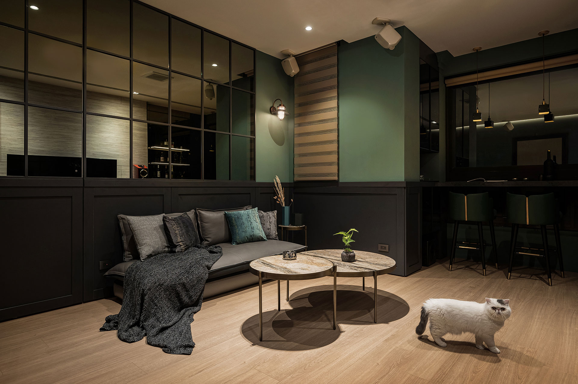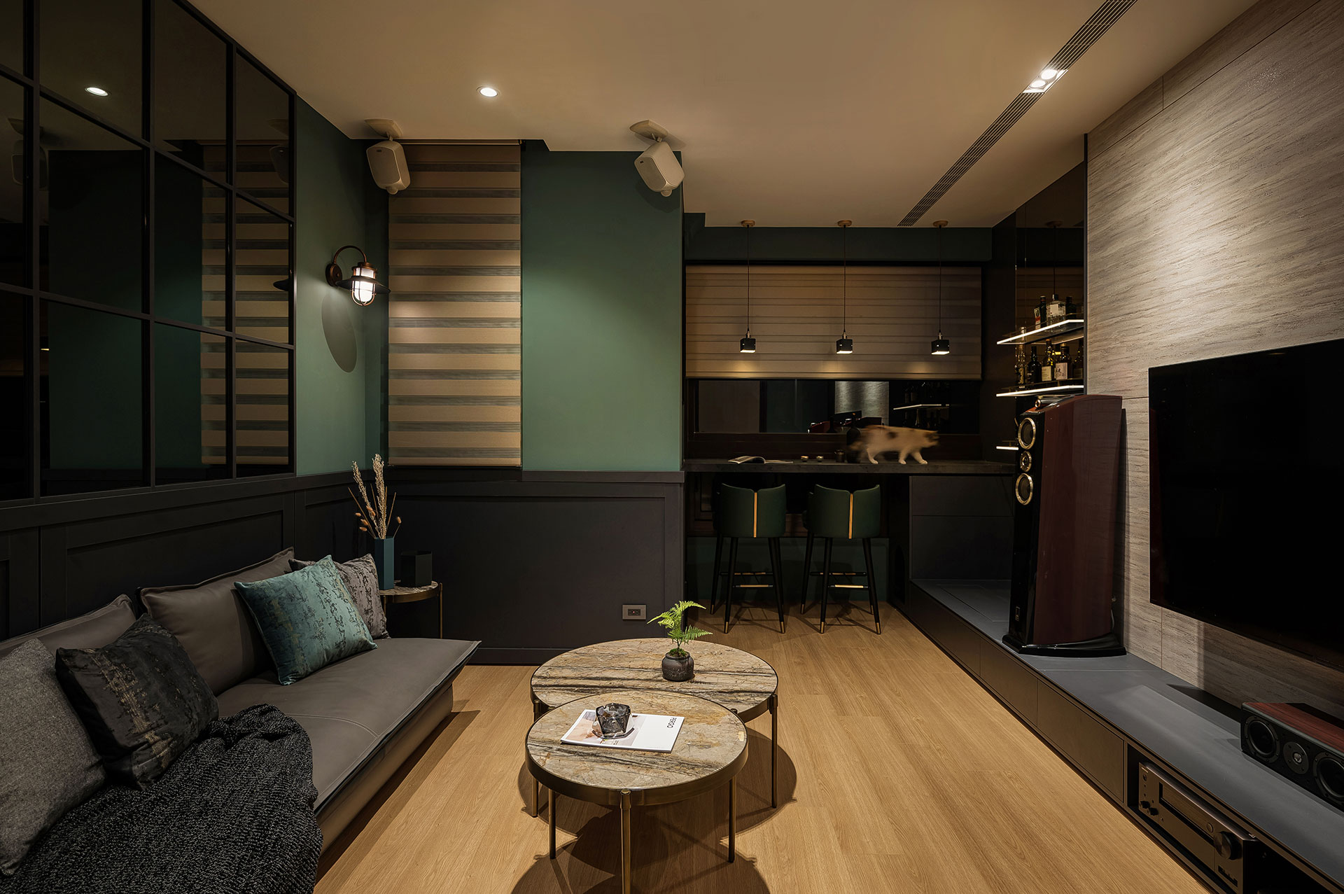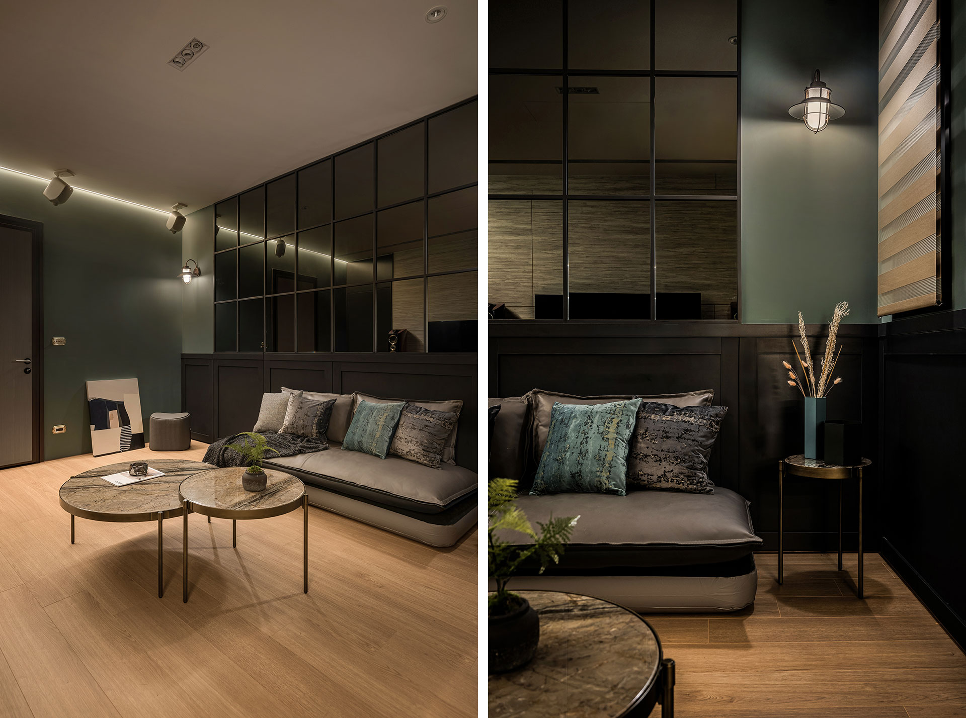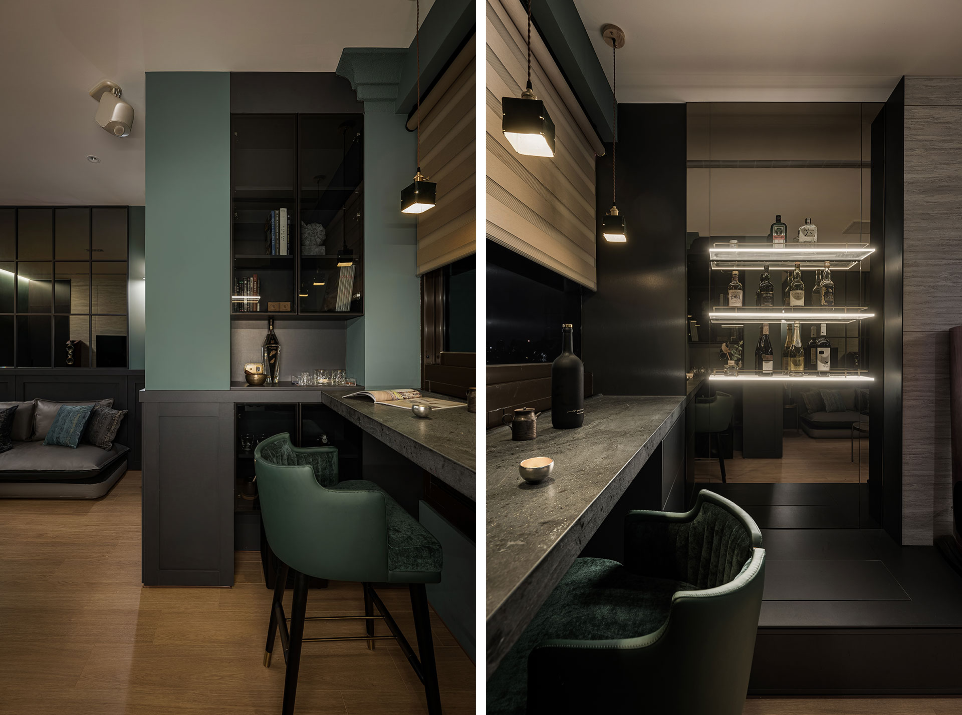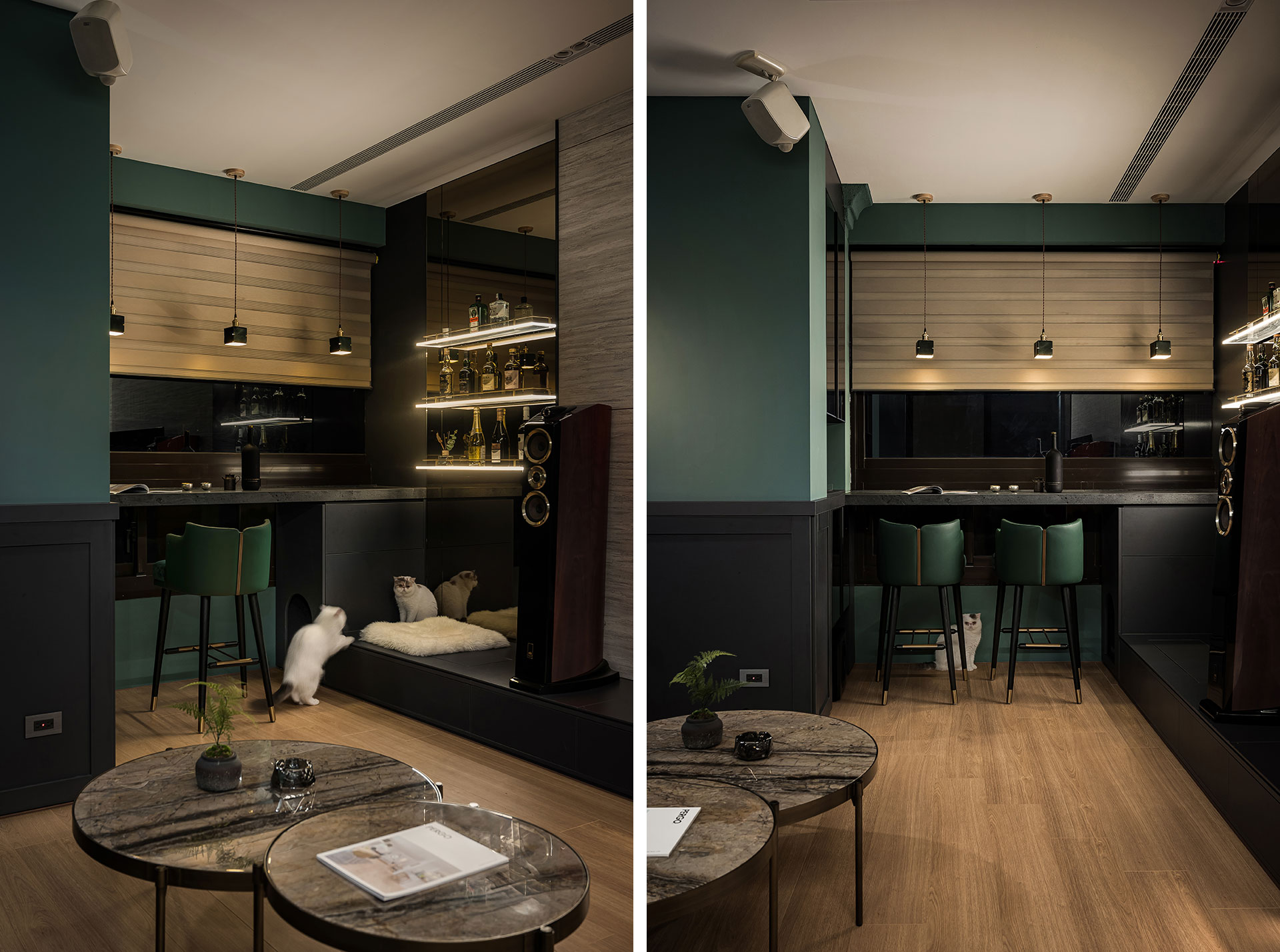沙發背牆將通往臥室的門片與牆面整合設計,使用不同板厚排列與離縫的手法,形成經典的美式線板與格子窗。靠窗空間設置品酒區域,水沖面石材搭配皮革吊燈,增添自然材料紋理觸感,與周圍鐵件、鏡面簡潔俐落的特性形成對比,配合牆面大膽用色,帶出男女主有力量又不失細節的個性。