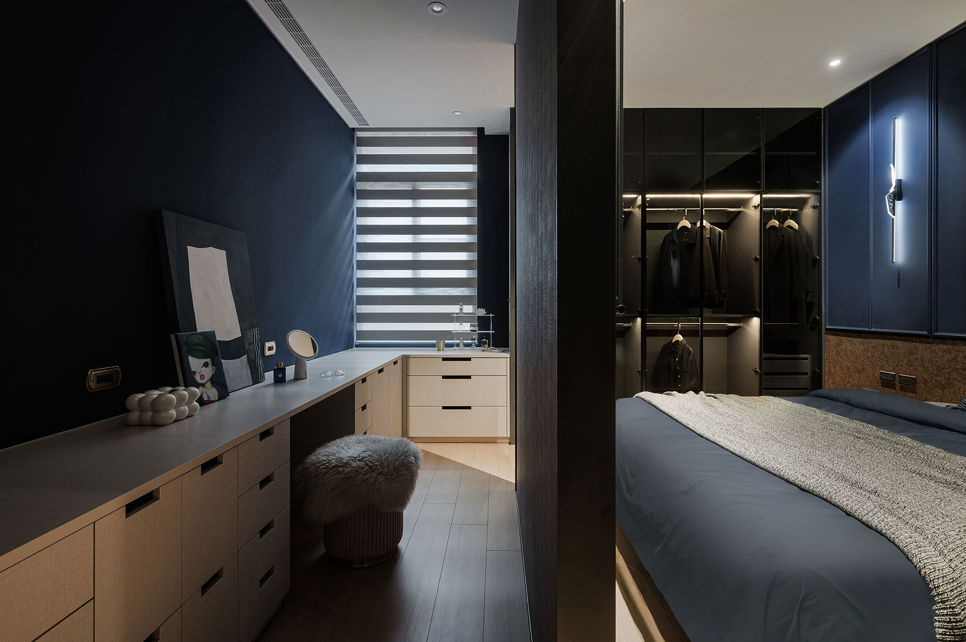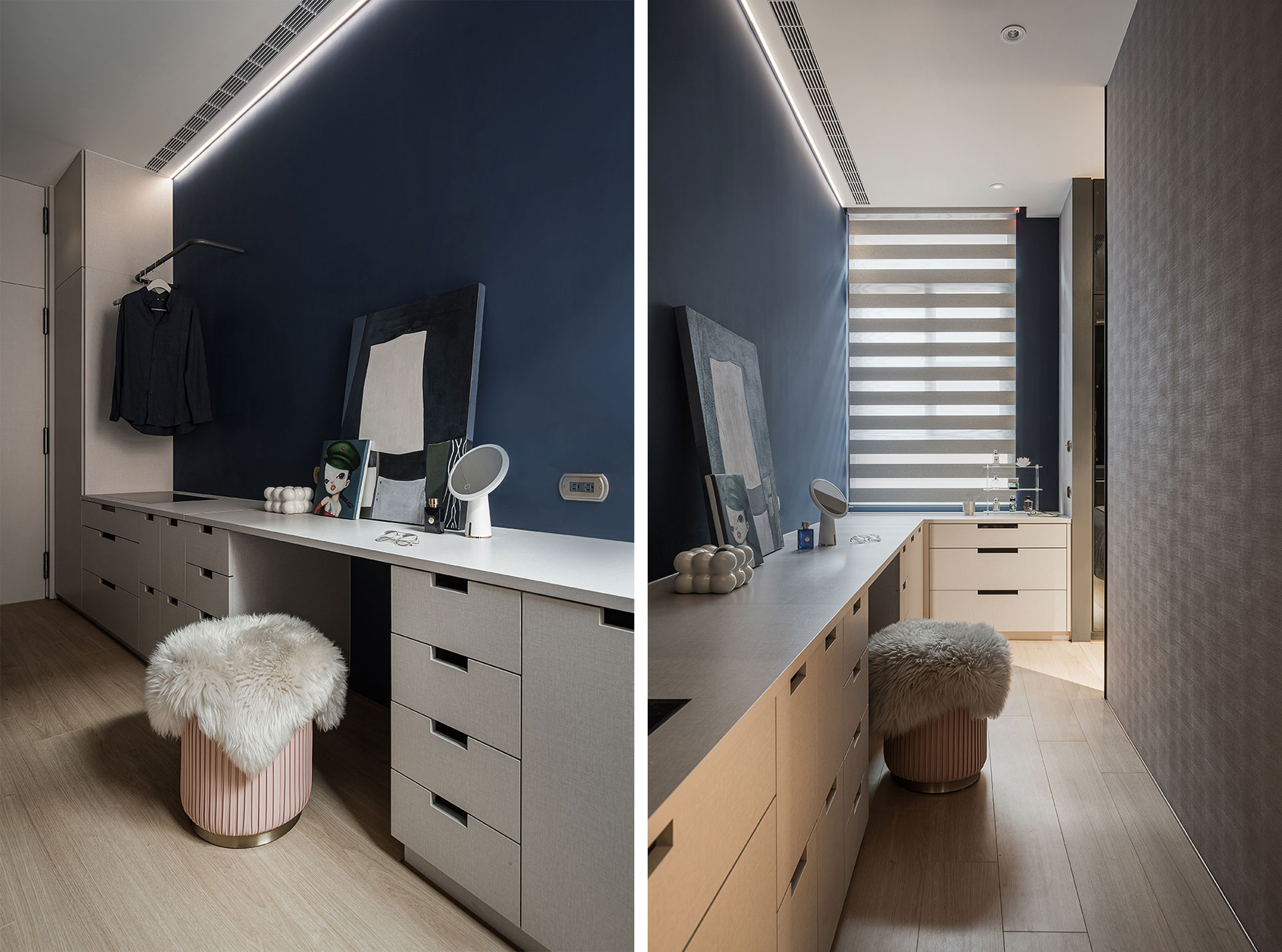 在這裡,燈光設計也是一大重點,分為兩種,氣氛照明與主照明,氣氛照明使用線燈+造型燈具點綴,線燈從客廳牆面延續進更衣間,漫射的洗牆漸層效果,讓刷色牆面有了明暗表情,也提供了整體放鬆的氛圍。
